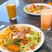 The attention to detail is remarkable. Fresh fruits and crisp greens, like lettuce and arugula, are thoughtfully maintained in water, ensuring they arrive at your table vibrant and crunchy. The juicy orange and strawberry juice adds a refreshing touch, making it a perfect companion to your meal.
